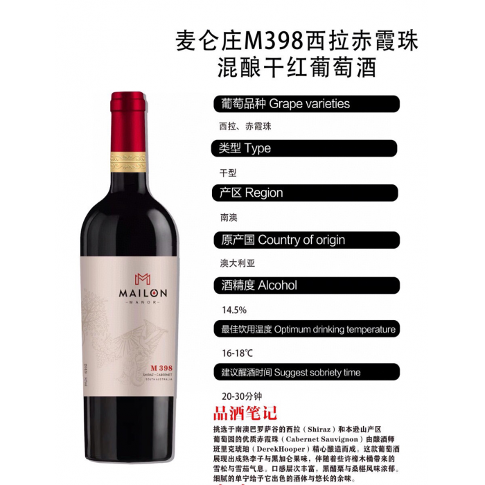 澳洲麦仑庄M398西拉赤霞珠混酿干红